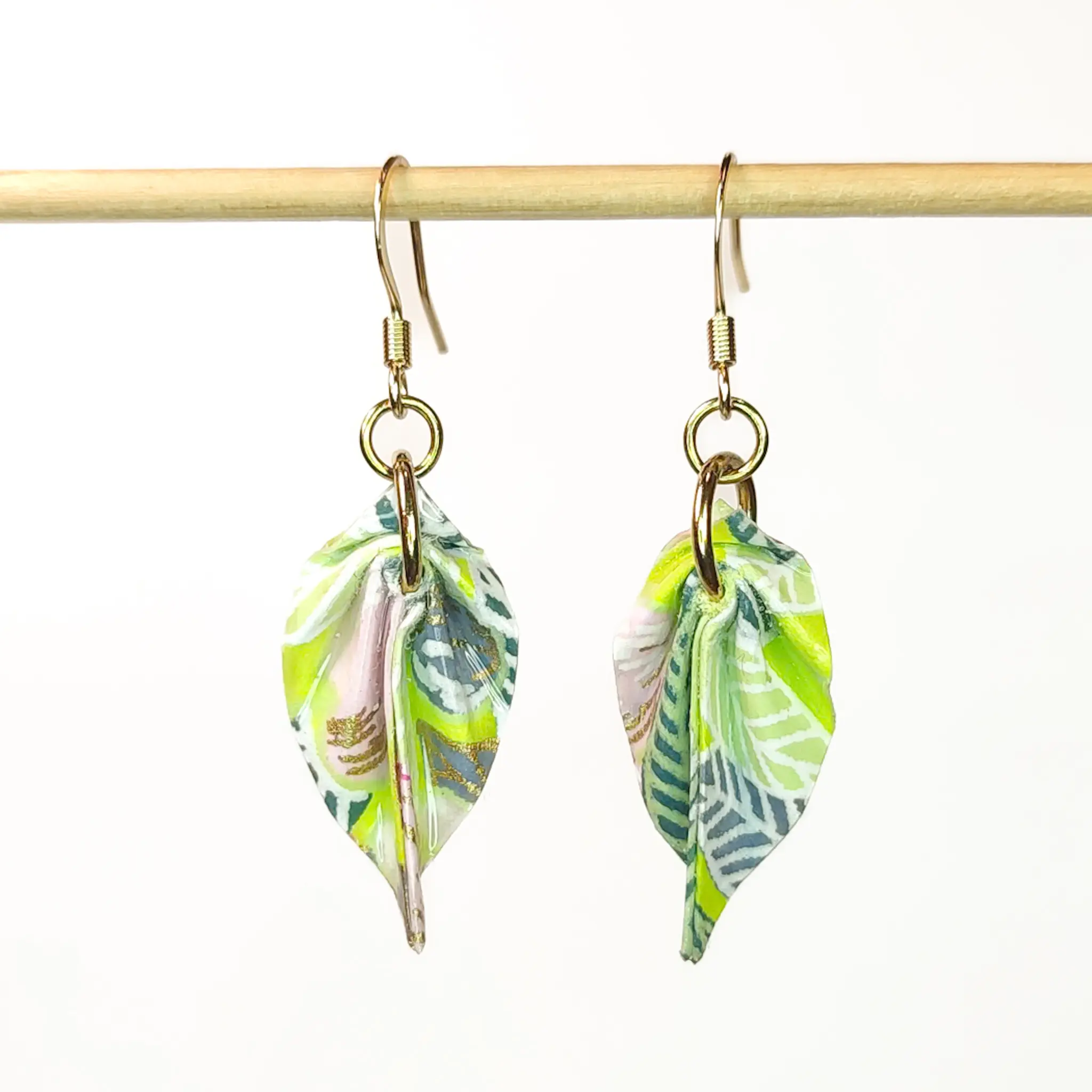 Boucles d’oreille origami feuille, légères et faites main en papier japonais Washi. Bijou unique et poétique pour ajouter une touche d’originalité à votre tenue.